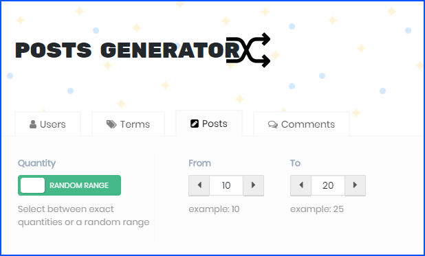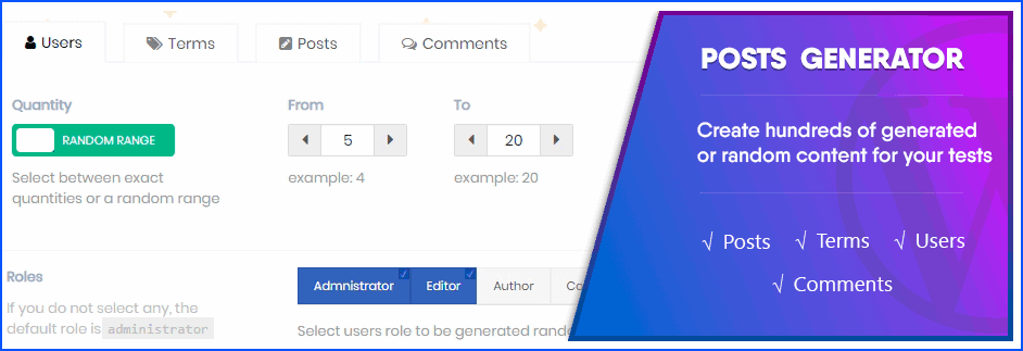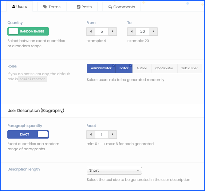 The Terms section will create new taxonomies, like categories and tags, for your posts, while the Comments section will create any given amount of comments for your posts or pages with any amount of paragraphs and tags.