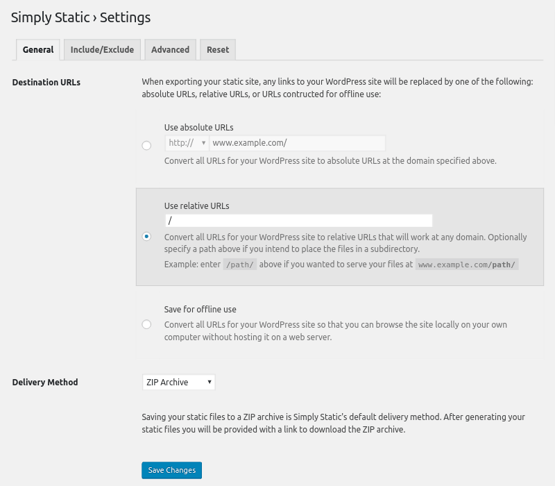 Useful only if you want to make your static version available online and replace your WP version or simply create a new version of your site at another URL. - Use relative URLs