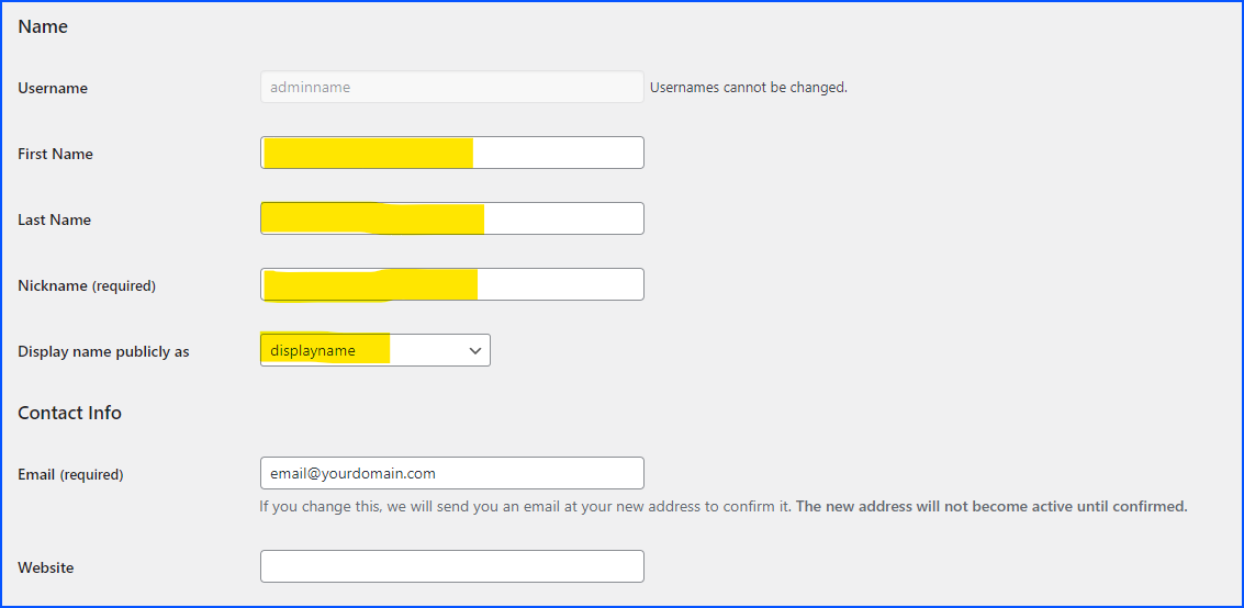 NOTE: you might want to delete ‘display_name’ and its corresponding value ‘displayname’ and add this afterwards at your WP dashboard, or simply add the entry ‘user_nicename’ (=nickname) and give it an identical value as for ‘displayname”.