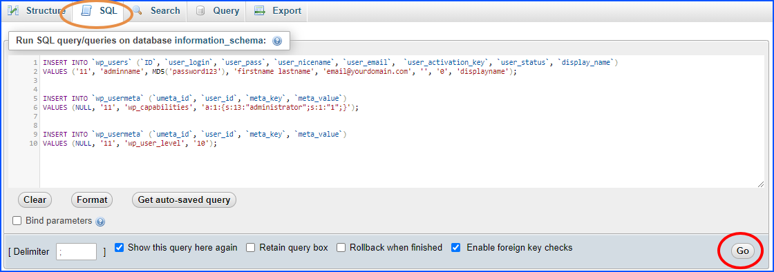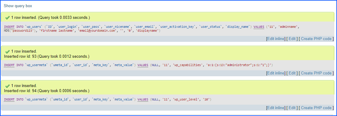 INSERT INTO `wp_users` (`ID`, `user_login`, `user_pass`, `user_nicename`, `user_email`, `user_activation_key`, `user_status`, `display_name`) VALUES ('11', 'adminname', MD5('password123'), 'firstname lastname', 'email@yourdomain.com', '', '0', 'displayname'); INSERT INTO `wp_usermeta` (`umeta_id`, `user_id`, `meta_key`, `meta_value`) VALUES (NULL, '11', 'wp_capabilities', 'a:1:{s:13:"administrator";s:1:"1";}'); INSERT INTO `wp_usermeta` (`umeta_id`, `user_id`, `meta_key`, `meta_value`) VALUES (NULL, '11', 'wp_user_level', '10');