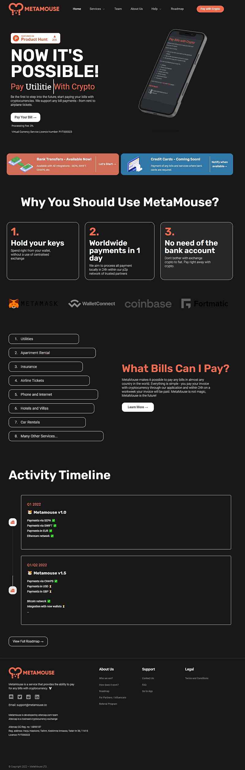 Metamouse is a service that allows you to pay any bill with cryptocurrency. At the moment, our project is ready and covers all European countries. Metamouse also has payment support for such cryptocurrencies as: