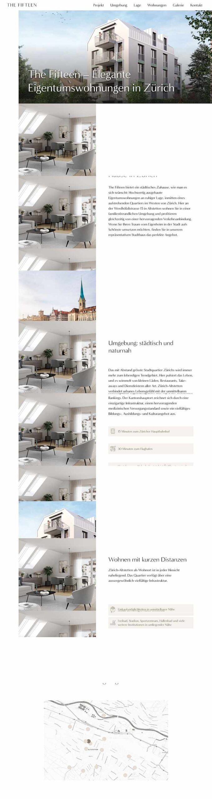 In the form of a modern onepager, which plays with various animations, such as a sticky scrolling effect, the luxurious condominiums of the fifteen are elegantly presented. A hover effect was created over the tabs, which, when hovering a column, colors the corresponding apartment in the adjacent graphic. Clicking on one of the columns opens a pop-up. The inquiry form was linked to a Google spreadsheet. After sending the contact form, the request is entered into this table.